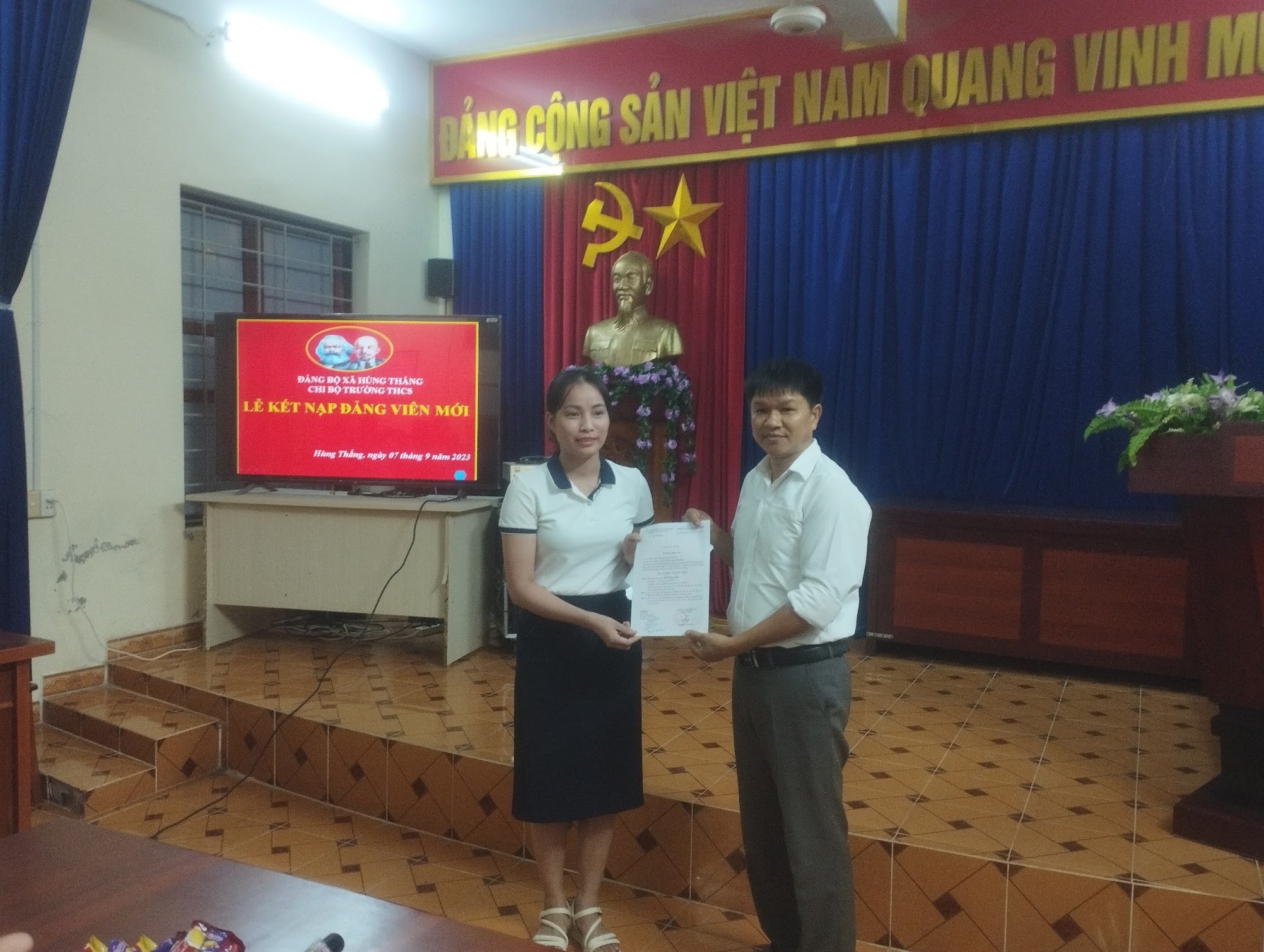 Buổi lễ kết nạp đảng viên đã diễn ra thành công tốt đẹp. Việc kết nạp 1 đồng chí đảng viên góp phần thực hiện tốt Nghị quyết của Chi bộ trường THCS Hùng Thắng quyết tâm phấn đấu đạt danh hiệu Chi bộ “Hoàn thành xuất sắc nhiệm vụ” năm 2023.