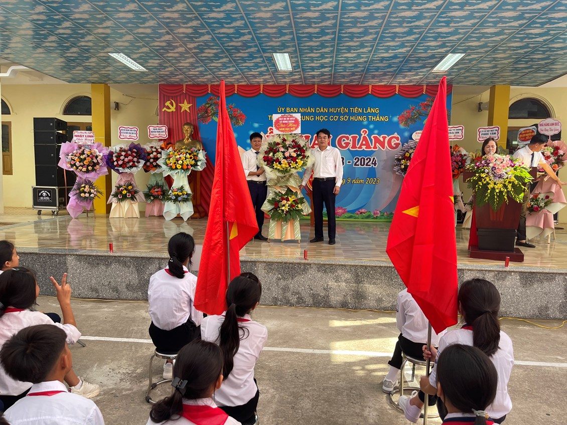 Về dự Lễ Khai giảng cùng nhà trường có sự tham dự của các đồng chí lãnh đạo: ông Trần Đình Nhuận -huyện Uỷ viên, trưởng phòng kinh tế hạ tầng huyện Tiên Lãng, ông Giang Văn Mạnh – Huyện ủy viên, Bí thư Đảng ủy xã Hùng Thắng cùng nhiều đồng chí đại biểu là trưởng/phó các ban ngành chính quyền địa phương, công an phường, hội CMHS. Nhà trường đã được lãnh đạo huyện, chính quyền địa phương, các sở/ban ngành, hội CMHS nhà trường tặng hoa chúc mừng năm học mới.