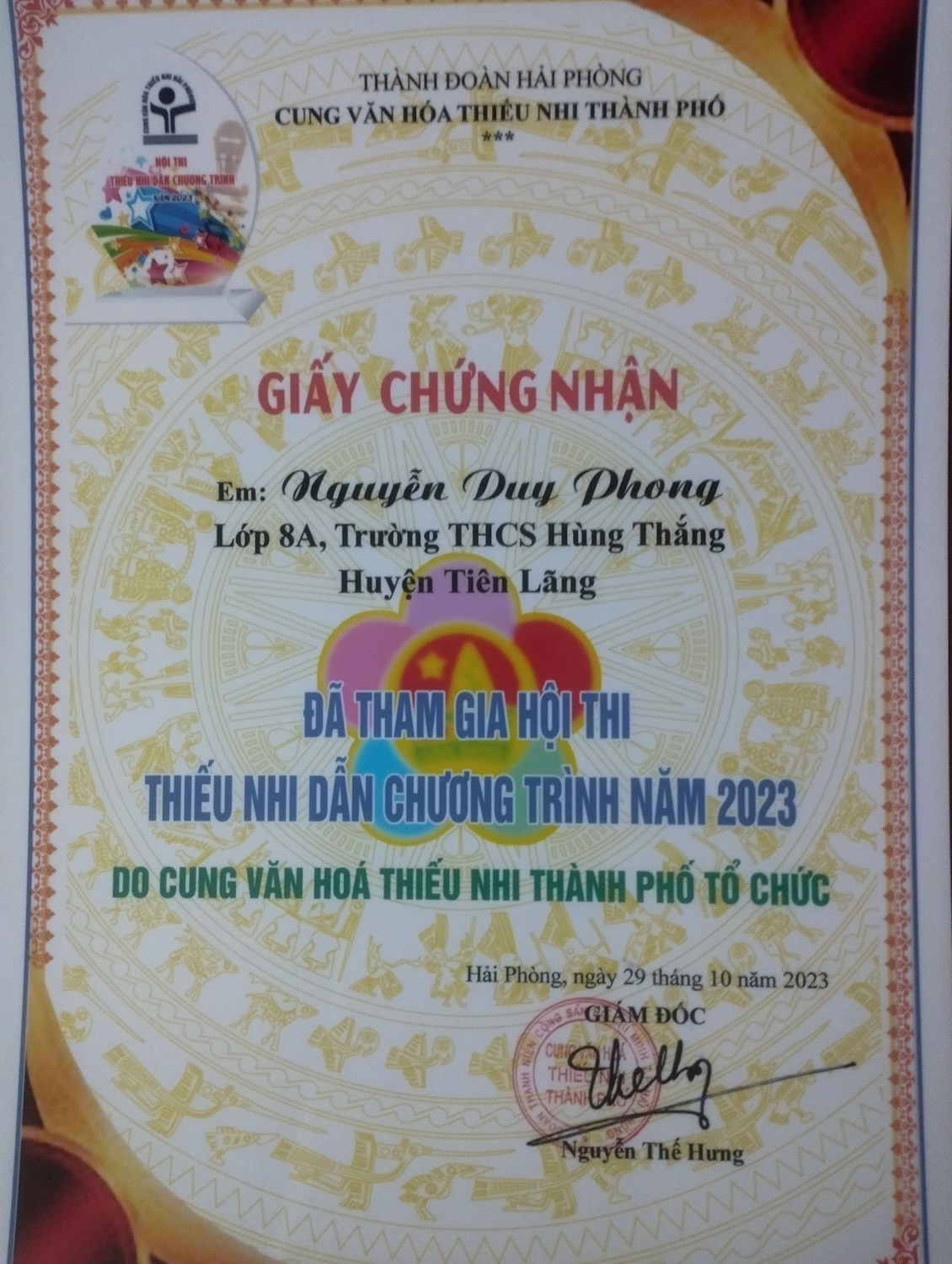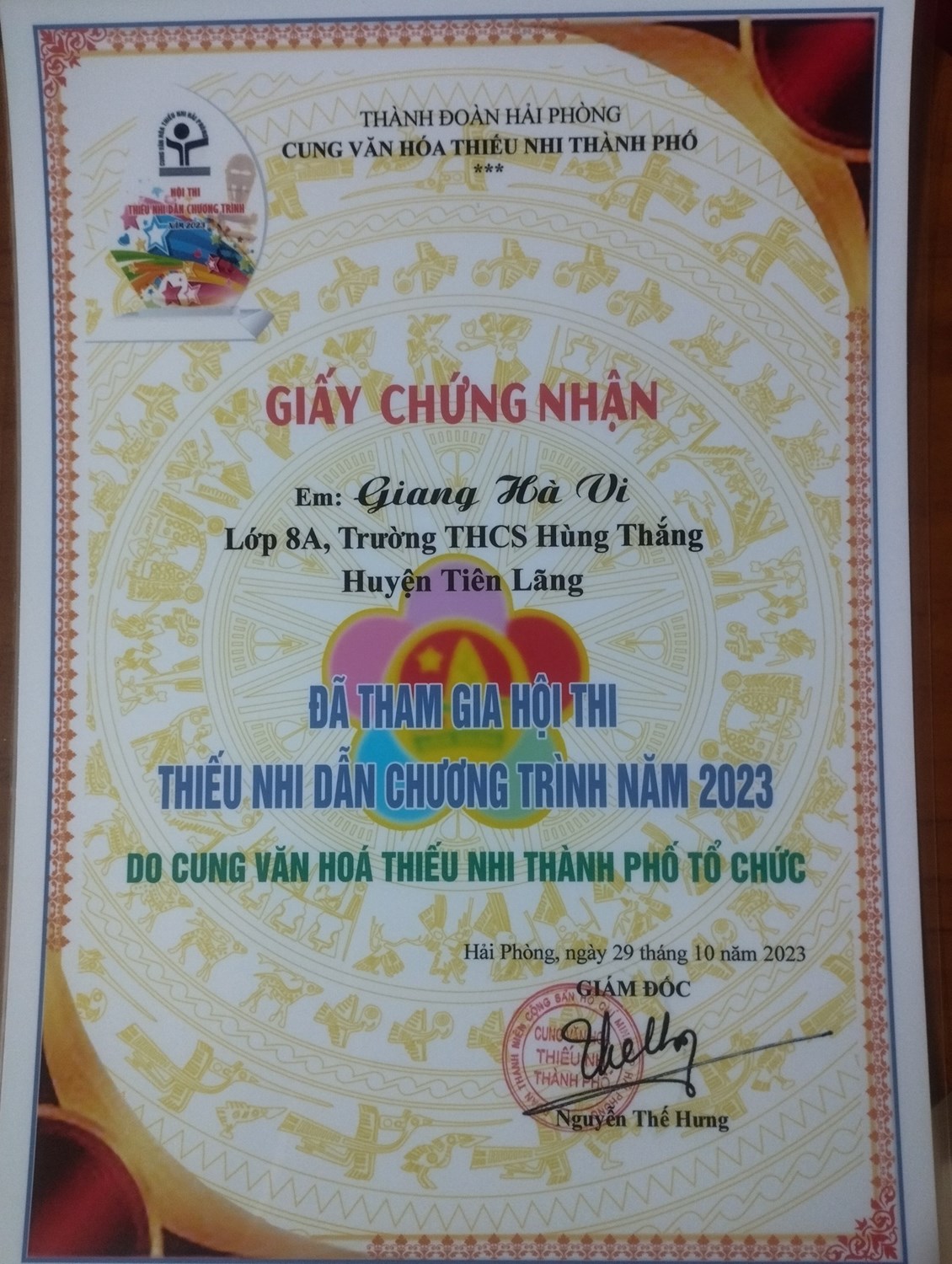 Ngày 28,29/10/2023 , Liên đội Trường THCS Hùng Thắng có bốn em học sinh tham gia vòng sơ khảo tại Cung văn hoá thiếu nhi thành phố là em Trần Thuỳ Dương, Giang Hà Vi, Nguyễn Duy Phong đều đến từ chi đội 8A và e Lê Ngọc Như Ý - chi đội 6A. Tại vòng sơ khảo, các em đã xuất sắc thể hiện trực tiếp trên sân khấu 01 bài thi trong thời gian 03 phút.Đa dạng hoá các nội dung phù hợp với lứa tuổi và thuần phong mỹ tục Việt Nam, có tính giáo dục và chính xác về thông tin.